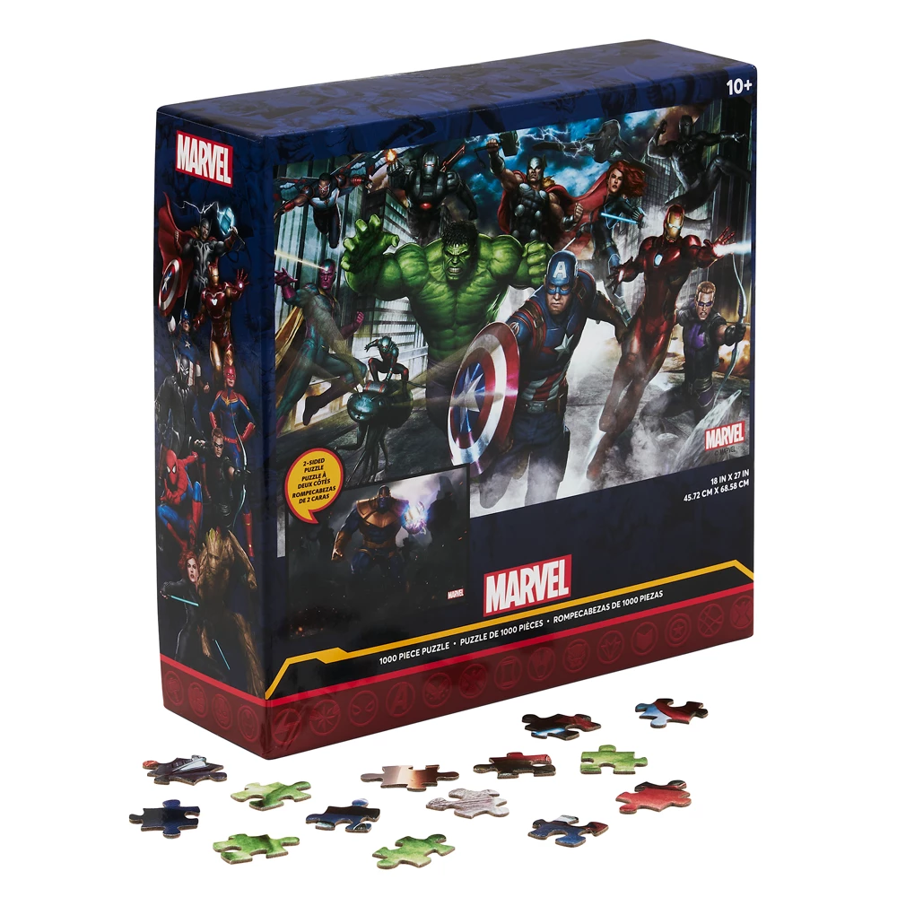 Les soirées jeux vont être riches en action avec ce puzzle 1 000 pièces Marvel ! Un côté représente différents héros Marvel, tandis que Thanos figure de l’autre côté. Un puzzle double face, c’est deux fois plus de divertissement en perspective !