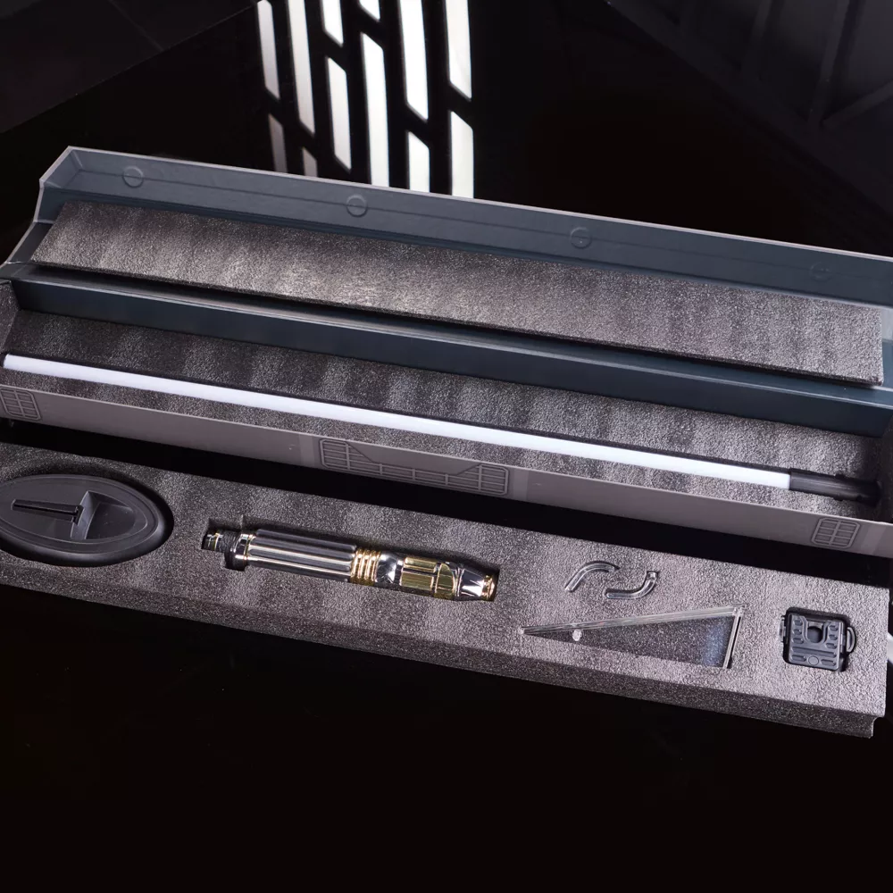 Un sabre laser fait sur mesure pour Mace Windu. Ce sabre laser détaillé est une arme noble pour une époque civilisée. La garde de cette pièce collector illumine la lame en violet. Le coffret contient également un socle et une attache pour fixer le sabre laser à une ceinture.